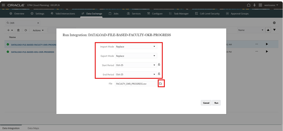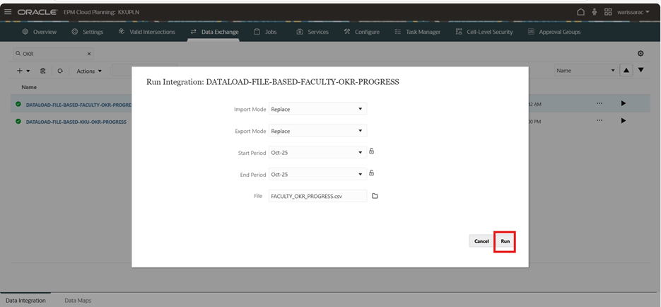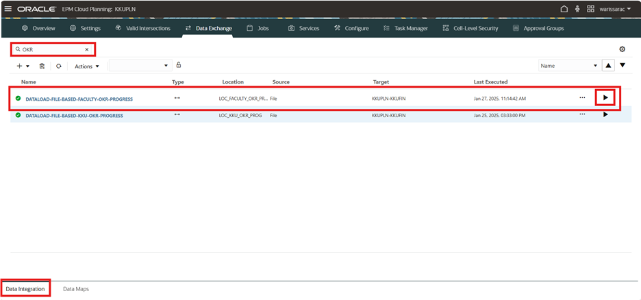 ค้นหา เส้นการนำเข้าข้อมูลที่ต้องการ เช่น รายละเอียดของแผนงานย่อยจะใช้เส้น ชื่อ “DATALOAD-FILE-BASED-FACULTY-OKR-PROGRESS” หลังจากนั้น คลิก สัญลักษณ์รูปสามเหลี่ยม(Run) |