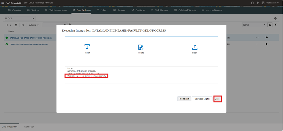 ผู้ใช้งานสังเกตข้อความบรรทัดล่างสุด หากอัปโหลดข้อมูลเข้าในระบบสำเร็จ บรรทัดสุดท้ายจะขึ้นข้อความตามนี้ “Integration process completed successfully” หลังจากนั้น กด “Close” |