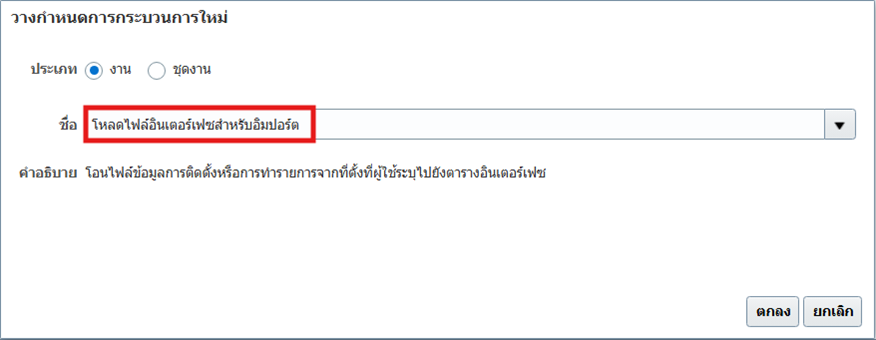 | 7 | เลือกชื่อรายงานจากรายการดรอปดาวน์ [Name] – โหลดไฟล์อินเตอร์เฟซสำหรับอิมปอร์ต [Load Interface File for Import] | |