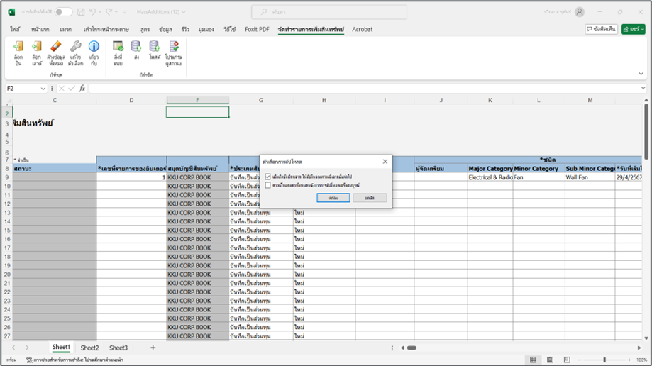 หน้าต่าง [เพิ่มสินทรัพย์ในสเปรดชีต] จะปรากฏขึ้น เลือกค่าที่เกี่ยวข้องจากรายการค้นหาค่า: · [สมุดบัญชี]: มี 1 สมุดบัญชีทรัพย์สิน ที่กำหนดค่าให้กับมหาวิทยาลัยขอนแก่น (KKU CORP BOOK) · [ประเภทสินทรัพย์]: บันทึกเป็นส่วนทุน / งานระหว่างก่อสร้าง (CIP) / ตัดเป็นค่าใช้จ่าย/กลุ่ม คลิกที่ [ดำเนินการ] หมายเหตุ: