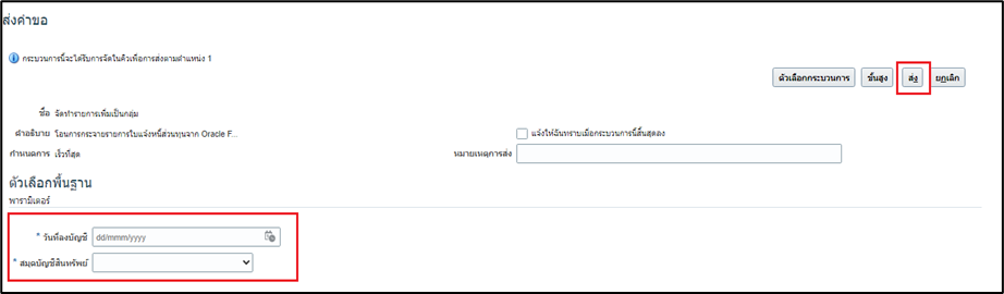 หน้าต่าง [ส่งคำขอ] จะแสดงขึ้น ระบุค่าในฟิลด์ที่จำเป็น (ที่มีเครื่องหมายดอกจันนำหน้า) ในส่วน [พารามิเตอร์] และอัปเดตฟิลด์เพิ่มเติมตามที่ต้องการ คลิก [ส่ง] เพื่อเรียกใช้กระบวนการ |