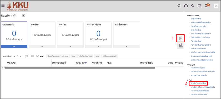 และเลือก [สืบค้นเรื่องสินทรัพย์] ในหน้า [สืบค้นเรื่องสินทรัพย์] ให้คลิกที่แท็บ [รายการเพิ่มล่าสุด] คลิกที่ไอคอน งาน > สืบค้นเรื่องสินทรัพย์ คลิกที่แท็บ “รายการเพิ่มล่าสุด” |