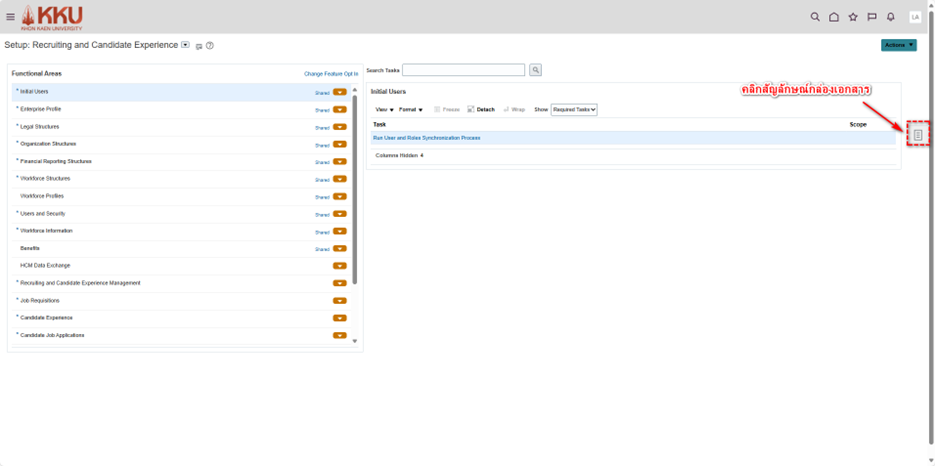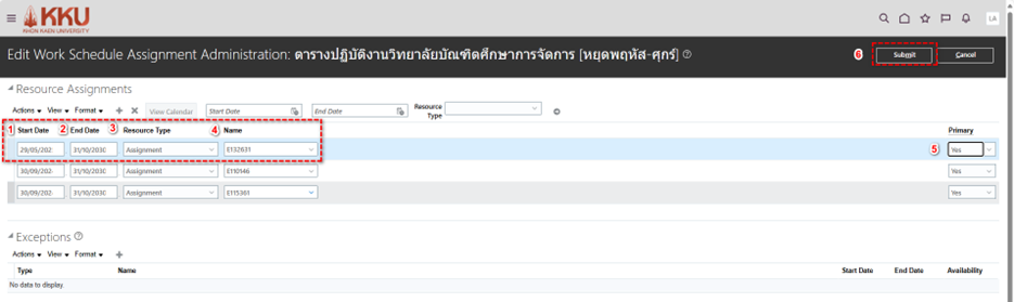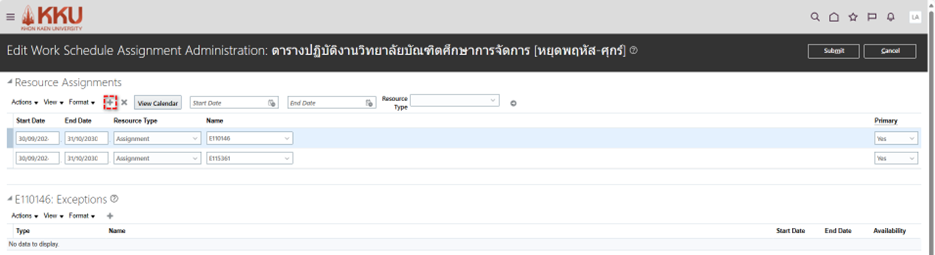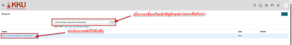 การกำหนดกะการทำงาน (Work Shift) ขั้นตอน การกระทำ 1. คลิกที่รูปโปรไฟล์ของตนเองด้านขวามือและไปที่ การตั้งค่าและการจัดการ (Setup and Maintenance) 2. คลิกที่รูปเอกสารสี่เหลี่ยมด้านขวา > ค้นหา (Search) 3. พิมพ์ค้นหา กะงาน (Work Shifts) 4. คลิก + ...