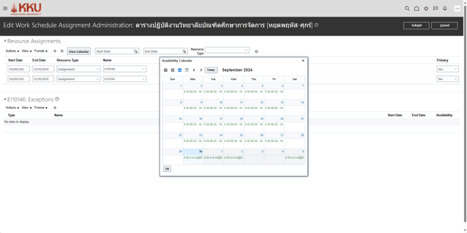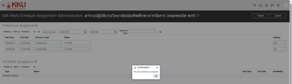 เลือกตารางงาน (Work Schedules) ที่ต้องการมอบหมายให้หน่วยงาน