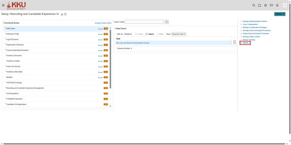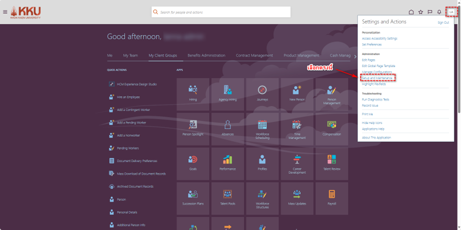 การกำหนดแบบแผนการทำงาน (Work Workday Pattern) ขั้นตอน การกระทำ 1. คลิกที่รูปโปรไฟล์ของตนเองด้านขวามือและไปที่ การตั้งค่าและการจัดการ (Setup and Maintenance) 2. คลิกที่รูปเอกสารสี่เหลี่ยมด้านขวา > ค้นหา (Search) 3. พิมพ์ค้นหา จัดการรูปแบบวันทำงาน ...
