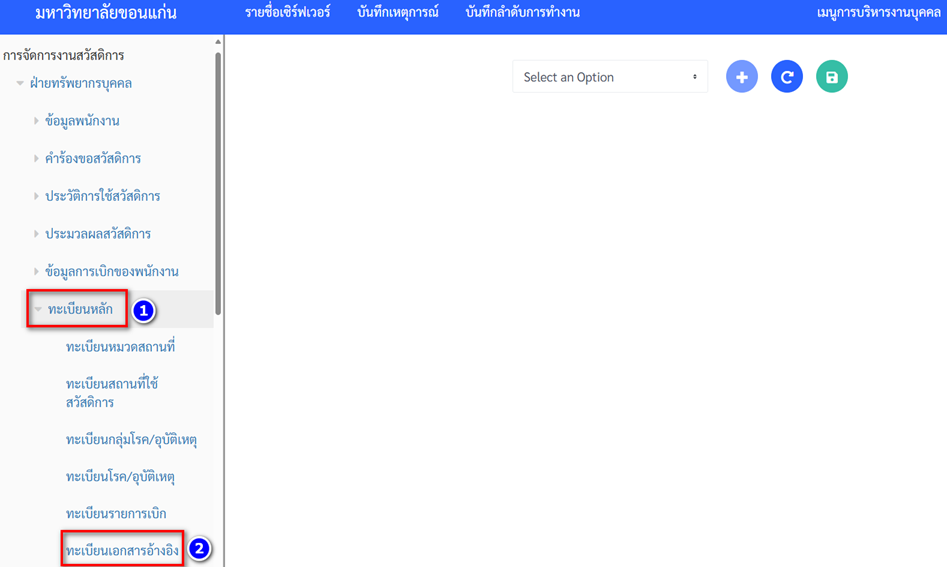 จากนั้นเลือกเมนูฝ่ายบุคคล > ทะเบียนหลัก > ทะเบียนเอกสารอ้างอิง