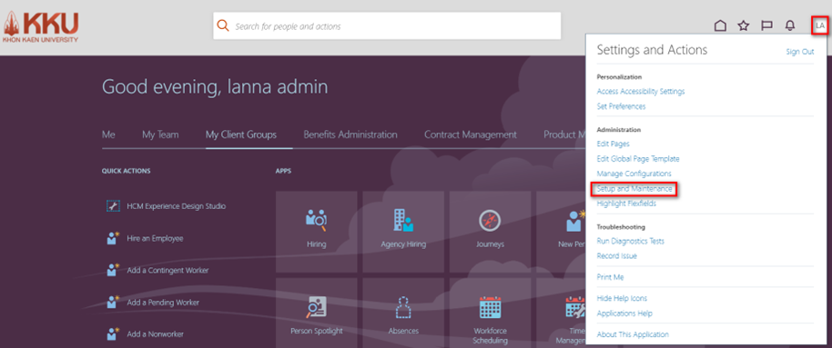 การจัดการข้อมูล HCM ระดับองค์กร การจัดการการข้อมูล HCM ระดับองค์กร คือการตั้งค่าองค์กร เช่น ตั้งค่าวันเวลาในทำงานขององค์กร เป็นต้น ตั้งค่าได้ตามกระบวนการดังต่อไปนี้ Navigation: My Client Groups→Show More→Manage Enterprise HCM Information ขั้นตอน ...