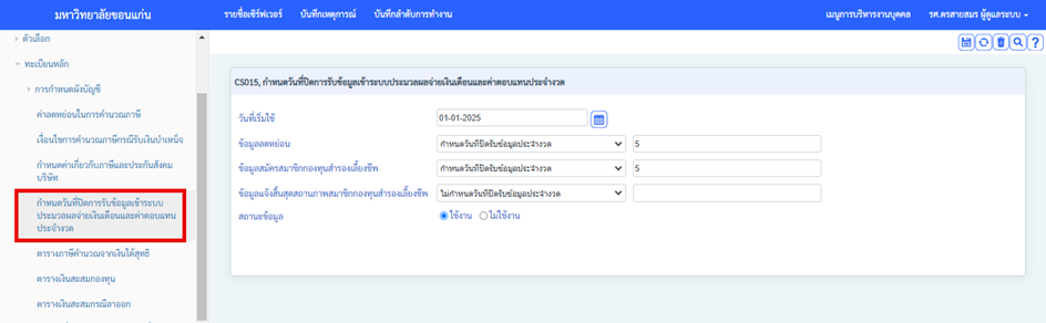 > ทะเบียนหลัก > กำหนดวันที่ปิดรับข้อมูลเข้าระบบประมวลผลจ่ายเงินเดือนแบะค่าตอบแทนประจำงวด