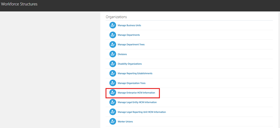การจัดการการข้อมูล HCM ระดับองค์กร คือการตั้งค่าองค์กร เช่น ตั้งค่าวันเวลาในทำงานขององค์กร