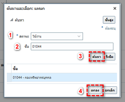 | 6. | เมื่อระบบแสดงช่องให้ทำการค้นหาจากแผนกขึ้นมา ให้ดำเนินการตามขั้นตอนดังภาพ 1. สถานะ ให้ทำการเลือกเป็น ใช้งาน 2.ชื่อ >> ค้นหาตามหน่วยงานที่ต้องการตรวจสอบ จากตัวอย่างค้นหา เช่น 01044 |