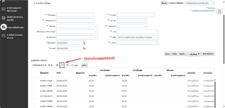 | 4. | จากตัวอย่างรูปภาพ เป็นการค้นหา รายการบันทึกเวลา ของส่วนงาน โดยให้ดำเนินการดังนี้ 1.ดำเนินการคลิกไปที่ขั้นสูง 2.ชื่อ ให้ดำเนินการเลือกประกอบด้วย และดำเนินการกรอกชื่อ 3.คลิกปุ่มค้นหา 4.คลิกแถวชื่อ หน่วยงานหรือส่วนงาน 5.ดำเนินการคลิก ตกลง 6.ใส่ข้อมูลวันที่เริ่มต้น >> 01/04/2024 7.ใส่ข้อมูลวันที่สิ้นสุด>> 31/04/2024 8.คลิกค้นหา 9.จากนั้นระบบจะแสดงผล รายการเวลา 10.สามารถ Export excel ออกมาได้ดังรูป   |