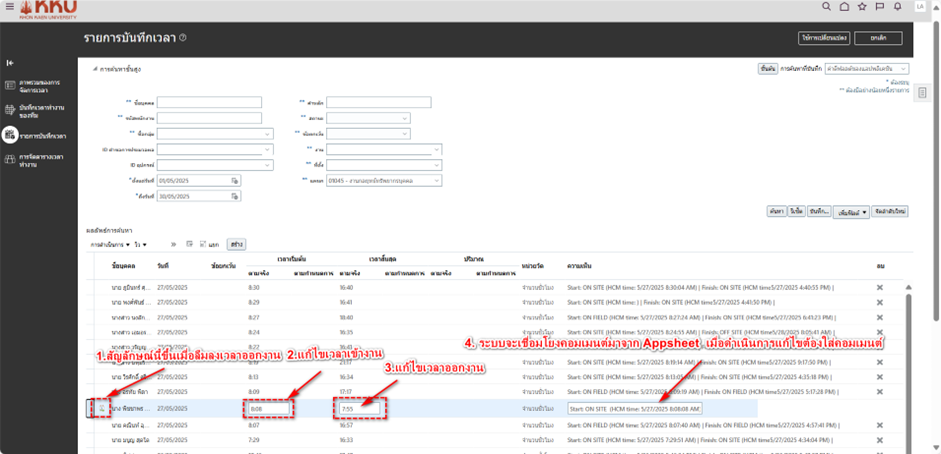 โดยการเข้าออกงานในระบบจริงของบุคลากรทั่วไป จะเป็นการเชื่อมต่อระหว่างระบบ Appsheet และระบบ Timecard(สถานะส่งแล้ว) |