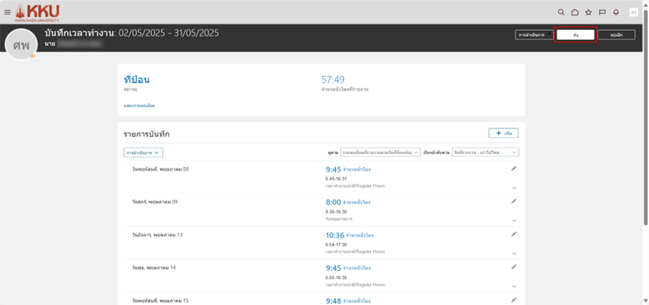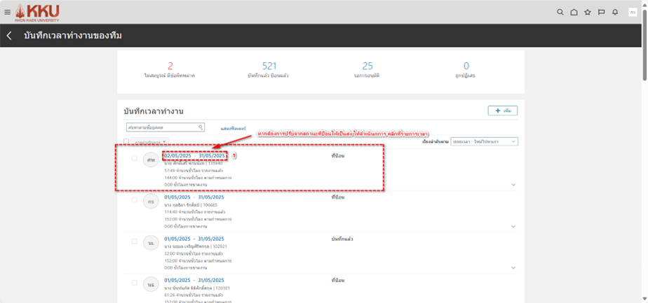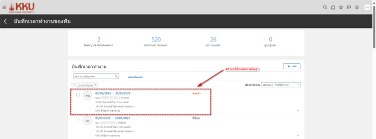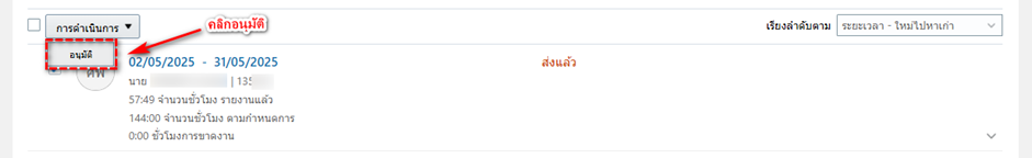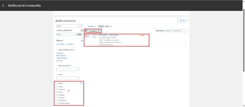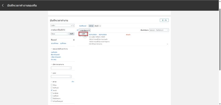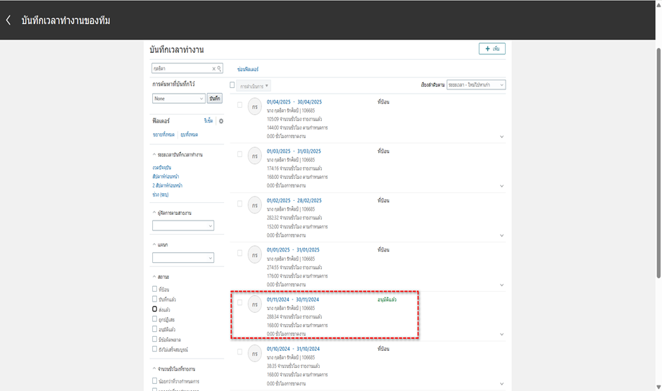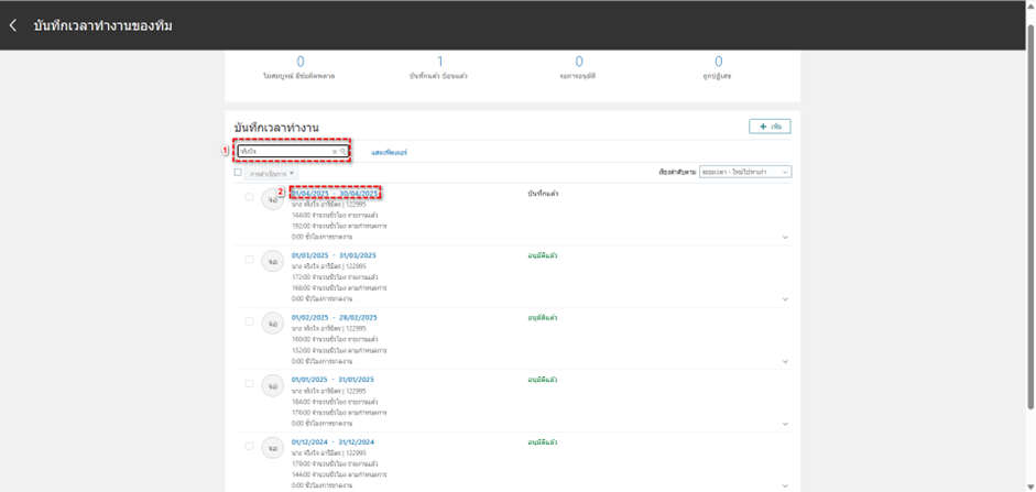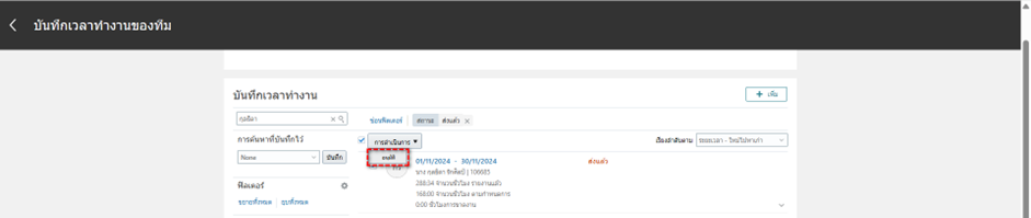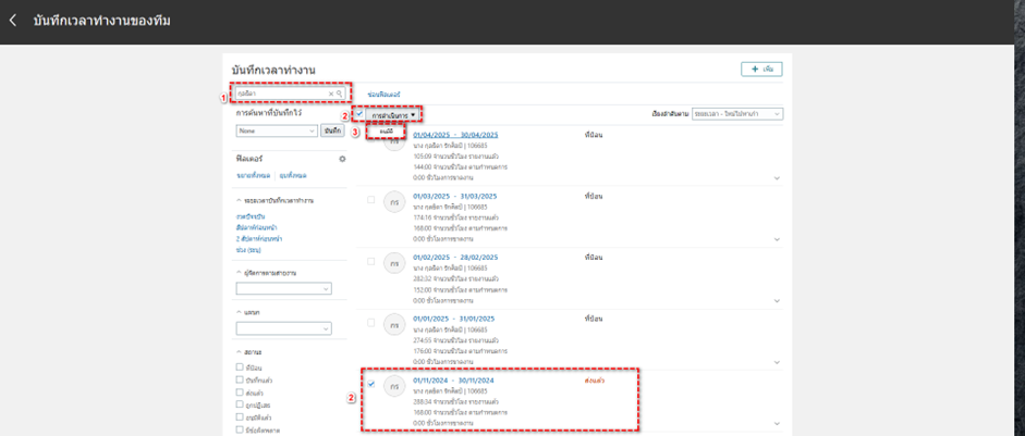 ฟิลเตอร์ข้อมูลตามรูปภาพด้านล่างเพื่อเข้าถึง Time Card เดือนปัจจุบันตามข้อมูลบุคลากรในสังกัดจากนั้นดำเนินการตามหน้าจอด้านล่าง เพื่อเลือกรายการที่ตรวจสอบแล้วและต้องการอนุมัติรายการเวลาของบุคลากร หมายเหตุ เพื่อเป็นการยืนยันรายการเวลาที่ถูกต้องเพื่อส่งต่อข้อมูลไปยังระบบเงินเดือน แอดมินจะต้องเข้ามาตรวจสอบรายการเวลาและกดอนุมัติรายการดังนี้