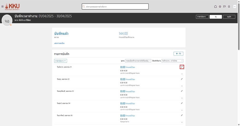 เมื่อเข้ามาในหน้าจอรายการลงเวลาของบุคลากรในสังกัดแล้ว หากต้องการแก้ไขให้ดำเนินการคลิกไปที่ รูปปากกา