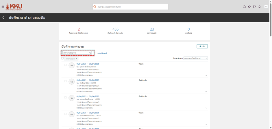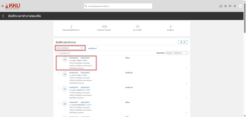 ค้นหาชื่อบุคลากร เพื่อทำการค้นหารายการบันทึกเวลาของบุคคลากรในสังกัด