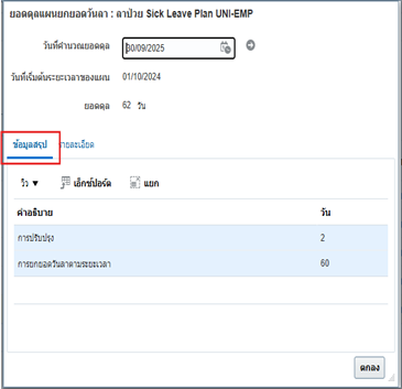 เมื่อดำเนินการคลิก ข้อมูลสรุป จากกนั้นระบบจะแสดง ยอดดุลของแผนการยกยอดวันลา จากภาพตัวอย่างมีการแสดงผลดังนี้: 1. แผนการลา คือ แผนลาป่วย -Sick Leave Plan Uni-Emp 2. วันที่เริ่มเต้นคำนวณ คือ วันที่เริ่มต้นปีงบประมาณ วันที่01/ต.ค./2024 1. จำนวนยอดดุล คือ จำนวนยอดดุลวันลาคงเหลือ 62 วัน 3. คำอธิบาย คือ อธิบายการปรับปรุงของแผน เช่น การยกยอดยวันลาตามระยะเวลา 4. วัน คือ ยอดดุลการลาที่ได้ทำการปรับ จากตัวอย่างคือ 2 |