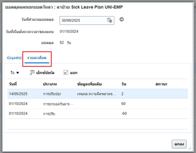 ทั้งนี้หากต้องการดูรายละเอียดข้อมูลการสรุปยอดดุลของแผนการลา ให้ดำเนินการคลิกไปที่รายละเอียด ซึ่งระบบจะแสดงดังนี้ 2. แผนการลา คือ แผนลาป่วย -Sick Leave Plan Uni-Emp 3. วันที่เริ่มต้นคำนวณ คือ วันที่เริ่มต้นปีงบประมาณ วันที่01/ต.ค./2024 ทั้งนี้กรณี บรรจุใหม่ให้ใส่วันที่ เริ่มต้นมีผลในการบรรจุ 4. จำนวนยอดดุล คือ จำนวนยอดดุลวันลาคงเหลือ 62 วัน 5. วันที่ คือใส่วันที่มีผลในการเริ่มต้นใช้สิทธิ์ ควรจะใส่เป็นวันที่เริ่มต้นปีงบประมาณ เช่น 01/10/2024 6. 2.ข้อมูลเพิ่มเติม คือเหตุผลสำหรับการปรับปรุง เช่น ความผิดพลาด 7. 3.วัน