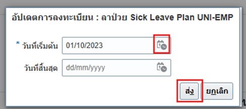 จากนั้นทำการ อัปเดทการลงทะเบียน เพื่ออัพเดทแผนการการลาที่ต้องการที่ต้องการเพิ่มสิทธิ์ให้กับบุคลากร และวันที่เริ่มต้น สำหรับการอัพเดทสิทธิ์ที่ต้องการ .ให้ดำเนินการคลิกไปที่ ปฎิทิน เพื่อเลือกวันที่มีผลในการเริ่มต้นใช้สิทธิ์