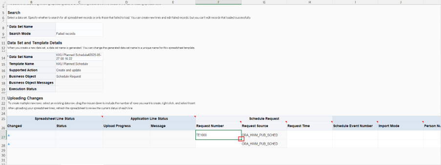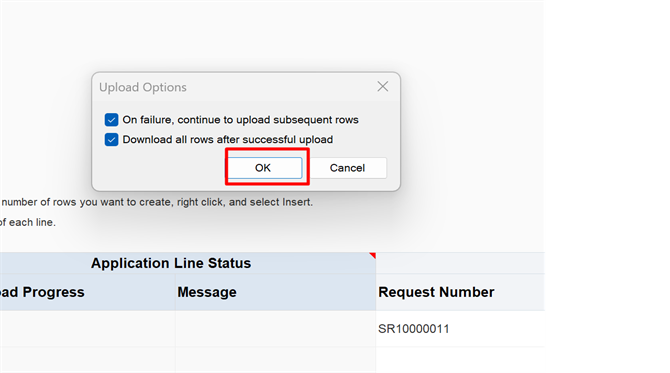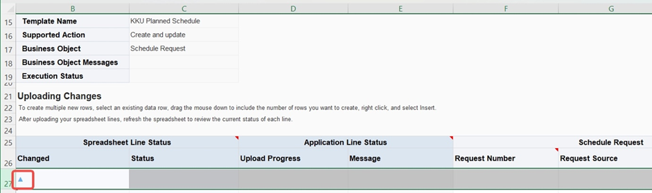จึงจะสามารถทำรายการอัปโหลดต่อไปได้ โดยใน Row ที่กรอกข้อมูลต้องมีสัญลักษณ์สีน้ำเงินด้านหน้าเท่านั้น |