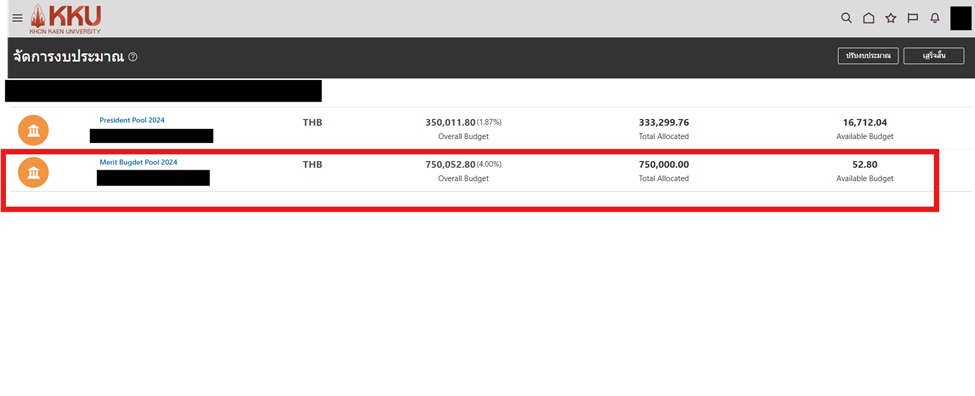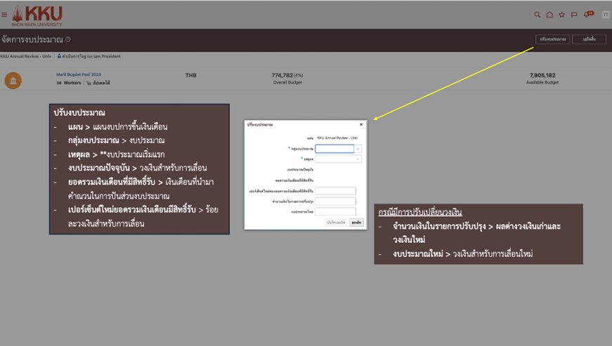 เลือก “Merit Budget Pool” หลังจากนั้น กด “ปรับงบประมาณ – Adjust Budget” ระบบจะทำการแสดงหน้าต่างใหม่เพื่อทำปรับงบประมาณ > เลือก - แผน > แผนงบประมาณขึ้นเงินเดือน - กลุ่มงบประมาณ > งบประมาณ - เหตุผล > **งบประมาณเริ่มแรก - งบประมาณปัจจุบัน > วงเงินสำหรับการเลื่อน - **ยอดรวมเงินเดือนที่มีสิทธิ์รับ > เงินเดือนที่นำมาคำณวนในการปันส่วนงบประมาณ - เปอร์เซ็นต์ใหม่ยอดรวมเงินเดือนมีสิทธิ์รับ > ร้อยละวงเงินสำหรับการเลื่อน (ระบุ 4% สำหรับแผนขึ้นเงินเดือนพนักงานมหาวิทยาลัย)