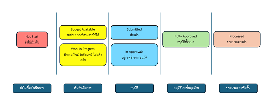 1. ยังไม่เริ่มต้น (Not Start) > ยังไม่เริ่มต้นดำเนินการ 2. งบประมาณที่สามารถใช้ได้ (Budget Available) > ยังไม่มีการแก้ไขเวิร์คชีท 3. งานที่อยู่ระหว่างดำเนินการ (Work in Progress) > มีการแก้ไขเวิร์คชีทแต่ยังไม่แล้วเสร็จ 4. ส่งแล้ว (Submitted) > มีการส่งเวิร์คชีทให้ผู้อนุมัติลำดับถัดไป 5. อยู่ระหว่างการอนุมัติ (In Approvals) > ผู้อนุมัติทำการอนุมัติเวิร์คชีทโดยที่ลำดับก่อนหน้ายังไม่ได้ส่งเวิร์คชีท - ตัวอย่างเช่น หาก Review Manager ยังไม่ Submit แผนการเลื่อนเงินเดือน Division Manager สามารถอนุมัติแทนได้เลยไม่จำเป็นต้องรอให้ Review Manager ซึ่งเมื่ออนุมัติแล้วสถานะของ Review Manager จะขึ้นเป็น อยู่ระหว่างการอนุมัติ (In Approvals) 6. อนุมัติทั้งหมด (Fully Approved) > เวิร์คชีทถูกอนุมัติโดยหัวหน้าขั้นสุดท้าย 7. ประมวลผลแล้ว (Processed) > เวิร์คชีทได้รับการประมวลผลแล้ว -