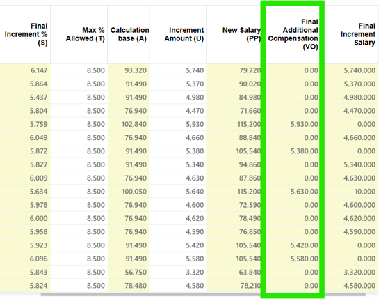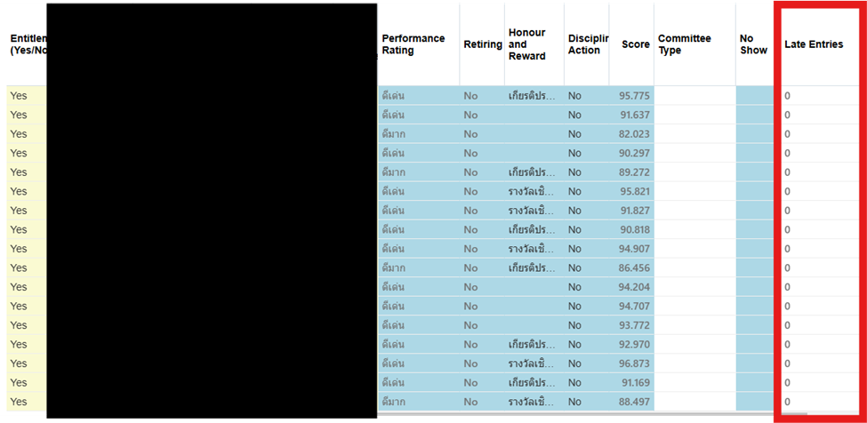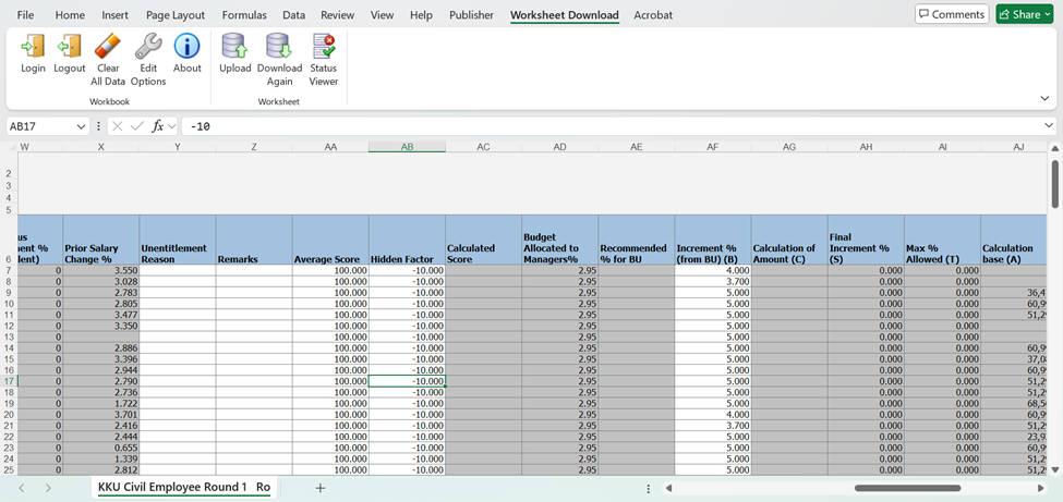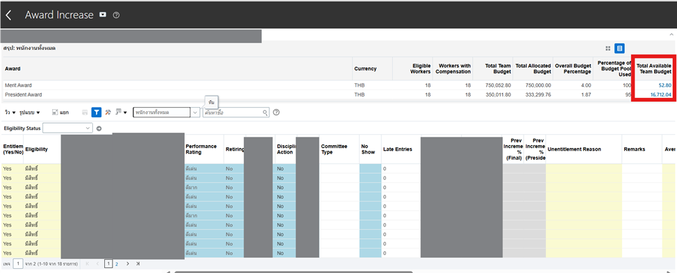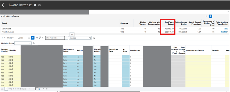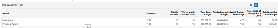 ในหน้าเวิร์คชีทมีรายละเอียดดังนี้ แถบสรุปข้อมูลของผู้ใต้บังคับบัญชา (แถบข้างบน) - Currency = สกุลเงิน - Eligible Worker > จำนวนพนักงานที่มีสิทธิ์ขึ้นเงินเดือน - Worker with Compensation > จำนวนพนักงานที่ได้รับค่าตอบแทนพิเศษ - Total Team Budget > งบประมาณของ Team ทั้งหมดที่สามารถปันส่วนให้แก่พนักงาน - Total Allocate Budget > งบประมาณที่หัวหน้าทีมทำการปันส่วนให้แก่พนักงานในเวิร์กชีท - Total Available Team Budget > งบประมาณที่เหลือสำหรับหัวหน้าทีมในในการใช้ปันส่วน |