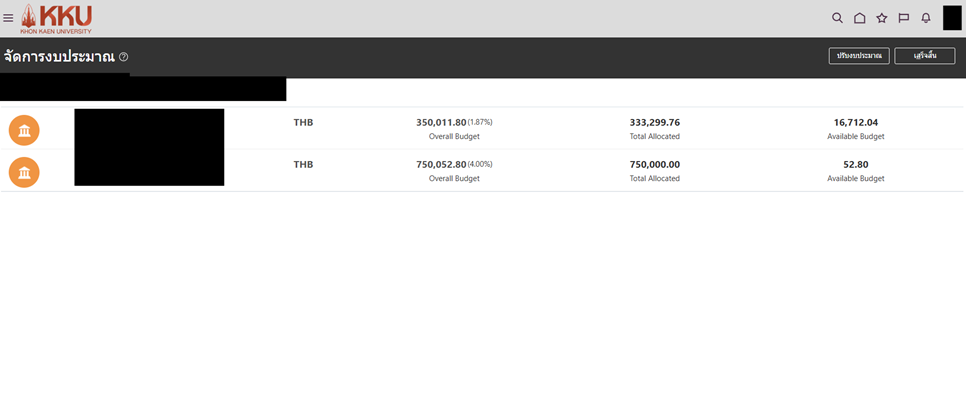 - รูปแบบการอนุมัติการปันส่วนของงบประมาณ - President > Division Manager) > Department Manager (เฉพาะสำนักอธิการบดี) > Review Manager (Academic/Research/Support) |