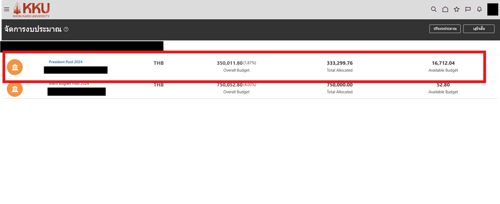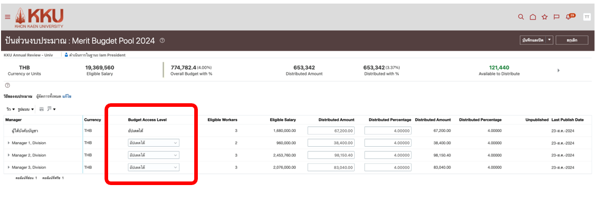 ไม่มีกระบวนการปันส่วนงบประมาณ (President Pool) เนื่องจากเราเลือกวิธีการจัดสรรงบประมาณเป็น - **ฉันจะไม่ส่งงบประมาณไปยังผู้จัดการในระดับต่ำกว่าฉัน แต่จะเก็บจำนวนเงินทั้งหมดไว้แทน > งบประมาณจะอยู่เพียงแค่ตำแหน่งอธิการบดี (President) |