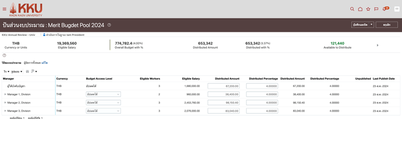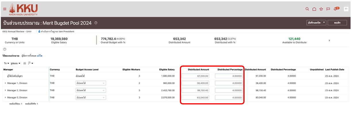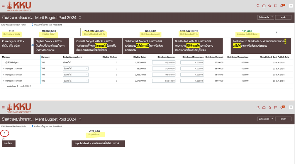 ในหน้าปันส่วนงบประมาณมีรายละเอียดดังนี้ แถบสรุปข้อมูล (ส่วนบน) - Currency or Unit > ค่าเงิน หรือ หน่วย - Eligible Salary > ผลรวมเงินเดือนที่นำมาคำณวนในการปันส่วนงบประมาณ - Overall Budget with % > ผลรวมของร้อยละงบประมาณทั้งหมดที่สามารถใช้ในการปันส่วนงบประมาณ - Distributed Amount > ผลรวมของจำนวนงบประมาณที่ได้ทำการใช้ในการปันส่วนงบประมาณ - Distributed with % > ผลรวมของงบประมาณที่ได้ทำการใช้ในการปันส่วนงบประมาณพร้อมกับระบุร้อยละ - Available to Distribute > ผลรวมของงบประมาณที่เหลือใช้จากการปันส่วนงบประมาณ - Unpublished > งบประมาณที่ยังไม่ประกาศ |