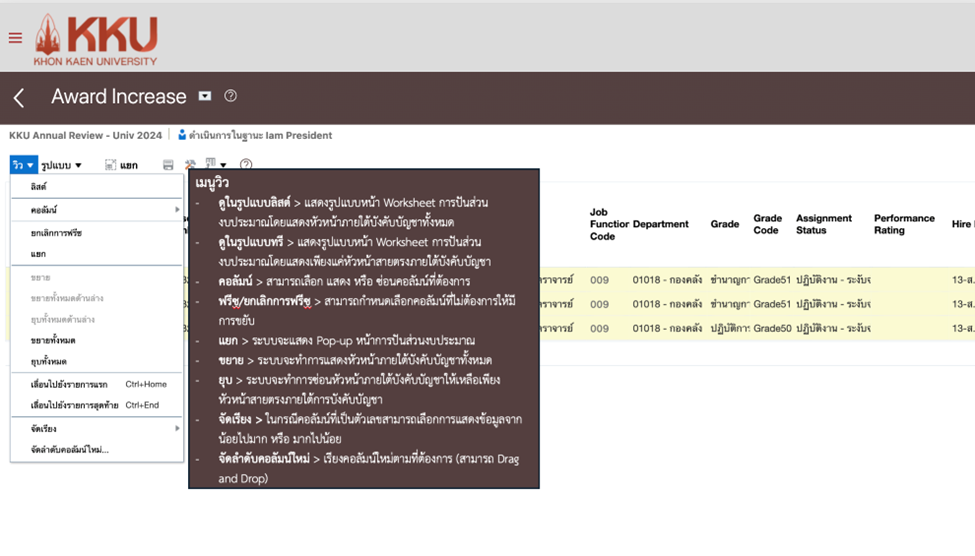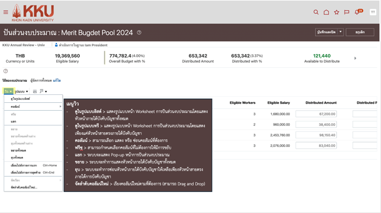 เมนูวิว - ดูในรูปแบบลิสต์ > แสดงรูปแบบหน้า Worksheet การปันส่วนงบประมาณโดยแสดงหัวหน้าภายใต้บังคับบัญชาทั้งหมด - ดูในรูปแบบทรี > แสดงรูปแบบหน้า Worksheet การปันส่วนงบประมาณโดยแสดงเพียงแค่หัวหน้าสายตรงภายใต้บังคับบัญชา - คอลัมน์ > สามารถเลือก แสดง หรือ ซ่อนคอลัมน์ที่ต้องการ - ฟรีซ/ยกเลิกการฟรีซ > สามารถกำหนดเลือกคอลัมน์ที่ไม่ต้องการให้มีการขยับ - แยก > ระบบจะแสดง Pop-up หน้าการปันส่วนงบประมาณ - ขยาย > ระบบจะทำการแสดงหัวหน้าภายใต้บังคับบัญชาทั้งหมด - ยุบ > ระบบจะทำการซ่อนหัวหน้าภายใต้บังคับบัญชาให้เหลือเพียงหัวหน้าสายตรงภายใต้การบังคับบัญชา - จัดเรียง > ในกรณีคอลัมน์ที่เป็นตัวเลขสามารถเลือกการแสดงข้อมูลจากน้อยไปมาก หรือ มากไปน้อย -
