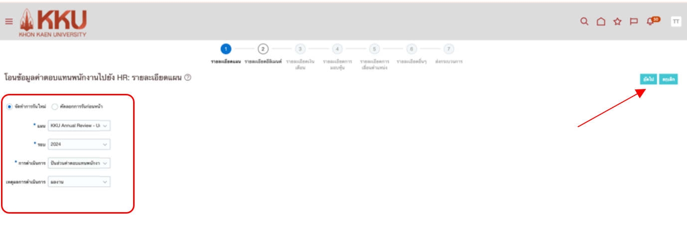 Compensation Center Admin ทำการ (1) ระบุรายละเอียดแผน โดย - เลือก > จัดทำการรันใหม่ - แผน > เลือกแผนการขึ้นเงินเดือนที่ต้องการ - รอบ > เลือกรอบตามแผนการขึ้นเงินเดือน - การดำเนินการ > เลือกปันส่วนค่าตอบแทนพนักงาน - เลือกเหตุผลการดำเนินการ > ผลงาน จากนั้นกด “ถัดไป” |