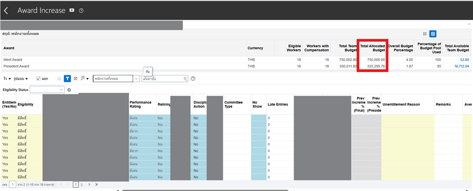 รายละเอียดหน้าการตั้งงบประมาณมีดังนี้ - Overall Budget > งบประมาณรวมทั้งหมด (มาจากการปรับงบประมาณ – Adjust Budget) - Allocated Budget > งบประมาณที่ปันส่วนทั้งหมด (มาจากการปันส่วนงบประมาณในเวิร์คชีทหน้า Merit Increase) -