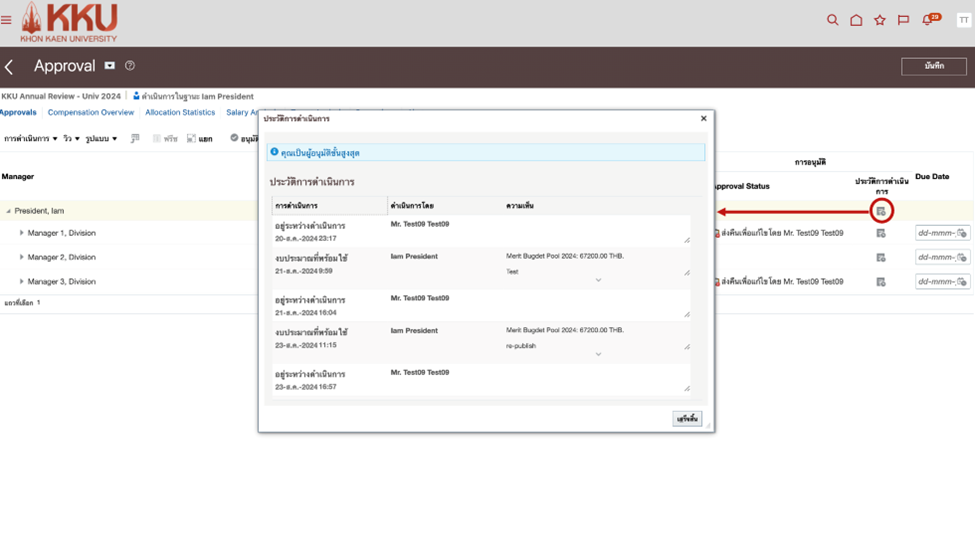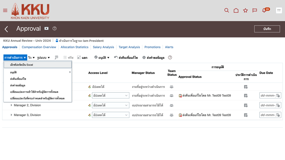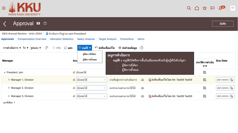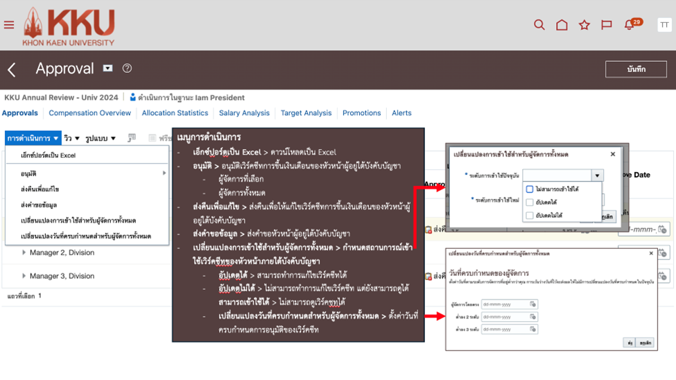 ในหน้า “Approval” เป็นเมนูเพื่อตรวจสอบสถานะการอนุมัติมีรายละเอียดดังนี้ (ส่วนบน) (1) เมนูการดำเนินการ - เอ็กซ์ปอร์ตเป็น Excel > ดาวน์โหลดเป็น Excel - อนุมัติ > อนุมัติเวิร์คชีทการขึ้นเงินเดือนของหัวหน้าผู้อยู่ใต้บังคับบัญชา - ผู้จัดการที่เลือก - ผู้จัดการทั้งหมด - ส่งคืนเพื่อแก้ไข > ส่งคืนเพื่อให้แก้ไขเวิร์คชีทการขึ้นเงินเดือนของหัวหน้าผู้อยู่ใต้บังคับบัญชา - ส่งคำขอข้อมูล > ส่งคำขอหัวหน้าผู้อยู่ใต้บังคับบัญชา - เปลี่ยนแปลงการเข้าใช้สำหรับผู้จัดการทั้งหมด > กำหนดสถานะเข้าใช้เวิร์คชีทของหัวหน้าภายใต้บังคับบัญชา - อัปเดตได้ > สามารถทำการแก้ไขเวิร์คชีทได้ - อัปเดตไม่ได้ > ไม่สามารถทำการแก้ไขเวิร์คชีท แต่ยังสามารถดูได้สามารถเข้าใช้ได้ - ไม่สามารถเข้าถึงได้ > ไม่สามารถดูเวิร์คชีทได้ -