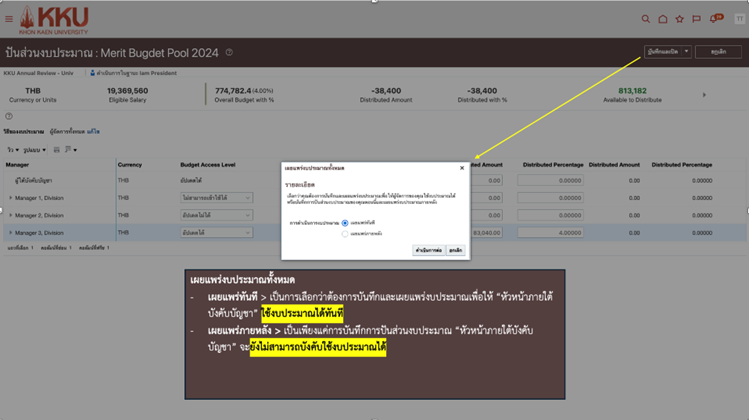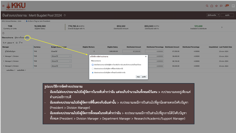หลังจากกด “บันทึกและปิด” ระบบจะแสดงหน้าต่าง “เลือกวิธีจัดทำงบประมาณ” เพื่อทำทำการส่งงบประมาณในรูปแบบต่าง ๆ ดังนี้ - **ฉันจะไม่ส่งงบประมาณไปยังผู้จัดการในระดับต่ำกว่าฉัน แต่จะเก็บจำนวนเงินทั้งหมดไว้แทน > งบประมาณจะอยู่เพียงแค่ตำแหน่งอธิการบดี (President) - ฉันจะส่งงบประมาณไปยังผู้จัดการที่ขึ้นตรงกับฉันเท่านั้น > งบประมาณจะมีการปันส่วนไปที่พนักงานภายใต้สายบังคับบัญชา (President > Division Manager) - ฉันจะส่งงบประมาณไปยังผู้จัดการทั้งหมดในระดับต่ำกว่าฉัน > งบประมาณจะมีการปันส่วนไปที่พนักงานภายใต้บังคับบัญชาทั้งหมด (President > Division Manager > Department Manager >Review Manager) |