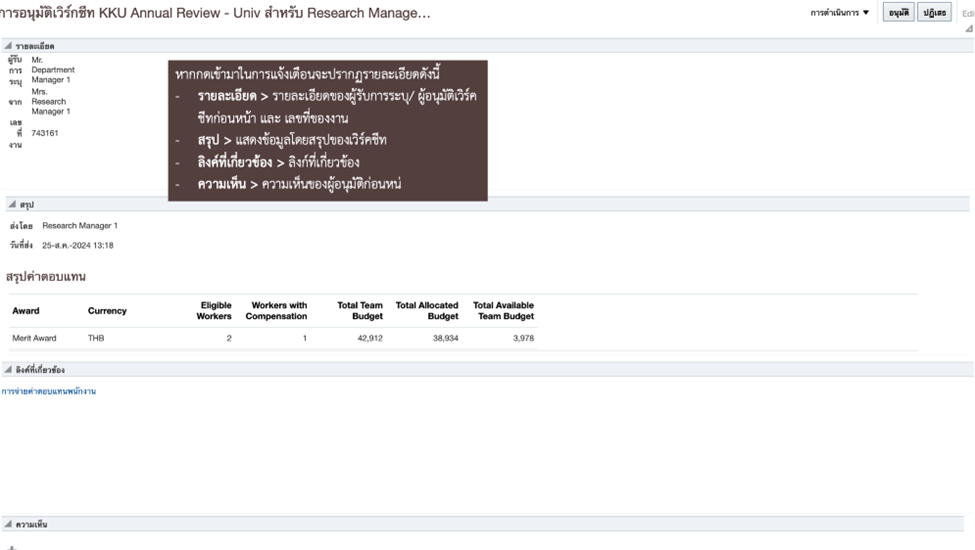 ในหน้าการแจ้งเตือนของผู้อนุมัติลำดับถัดมาจะปรากฏการแจ้งเตือน ซึ่งสามารถกด - Approve > หากกด Approve ผู้ดูแลเวิร์คชีท ก่อนหน้าจะไม่สามารถทำการ “เพิกถอน” เวิร์คชีทได้อีก -