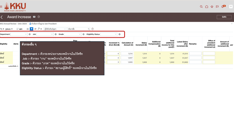 ตัวกรองอื่น ๆ ที่สำคัญ - Department > ตัวกรองหน่วยงานของพนักงานในเวิร์คชีท - Job > ตัวกรอง “งาน” ของพนักงานในเวิร์คชีท - Grade > ตัวกรอง “เกรด” ของพนักงานในเวิร์คชีท -