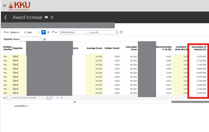 กรณีมีการปรับเปลี่ยนวงเงิน - จำนวนเงินในรายการปรับปรุง > จำเป็นต้องมีการคำนวณนอกระบบตรวจสอบวิธีการคำนวณได้ในส่วนของหมายเหตุ (ระบุเป็นจำนวนสำหรับแผนขึ้นเงินเดือนพนักงานมหาวิทยาลัยส่วนกลาง) - งบประมาณใหม่ > วงเงินสำหรับการเลื่อนใหม่