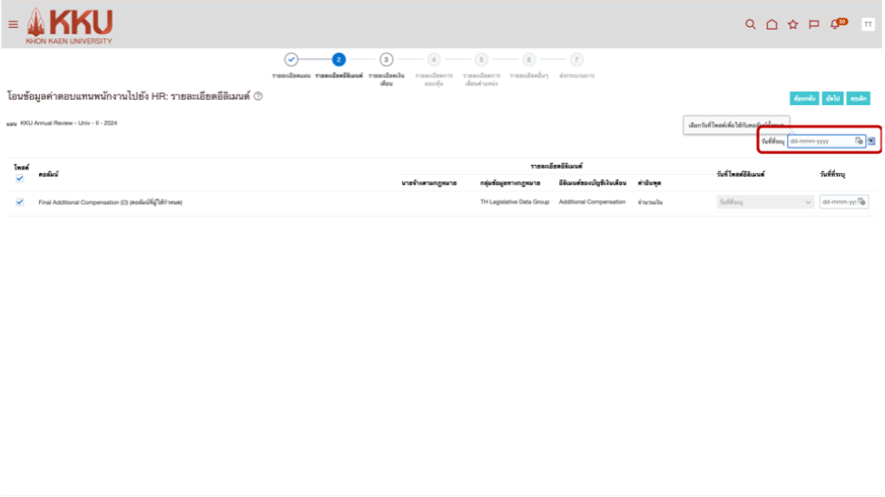Compensation Center Admin ทำการ (2) กำหนดรายละเอียดอีลิเมนต์์ โดย - ระบุวันที่มีผลที่ต้องการ (New Salary Effective Date) กดสัญลักษณ์ |