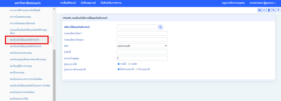 รหัสรายได้และเงินหักประจำ : กำหนดรหัสเงิน