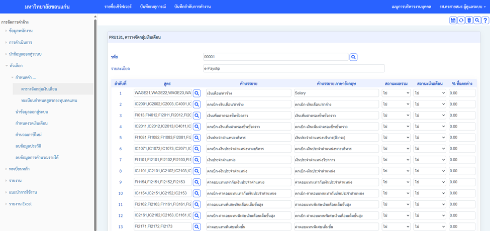 - ระบุรหัสสายงาน - ระบุรายละเอียดของรายงาน - เลือกสูตรรายได้ หรือรายการหักที่ต้องการ - ระบุคำออธิบายสูตร - เอกสถานะผลรวม เป็นการระบุว่ารายได้หรือรายการหักที่ได้ทำการเลือกนั้น ให้ระบบรวมยอดให้รหือไม่ ดยในช่องสูตรผู้ใช้สามารถระบุหลายสูตรมาผูกกันได้ เช่น ในช่องรวมรายได้ เป็นต้น กรณีเลือกสถานะว่าเป็น “ไมใช่” จะแสดงยอดเป็นรายได้หรือรายหักโดยมีเครื่องลบ (-) แสดงด้านหน้า - เลือกสถานะเงินเดือน คือ ระบุว่ารายการที่เราได้ทำนั้นต้องการให้แสดงยอดในรายงานเป็นบวกหรือไม่ หากตอบใช่ ยอดที่แสดงจะเป็นบวก หากไม่ไม่ใช่ ยอดที่แสดงจะเป็นลบ |