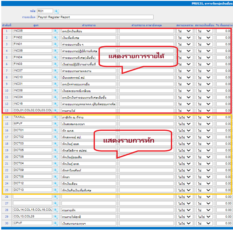 ตัวอย่างการกำหนดตารางรางจัดกลุ่มข้อมูลเพื่อออกรายงาน รายงาน R01: Payroll Register Report รายงานนี้เป็นการรายแสดงรายได้